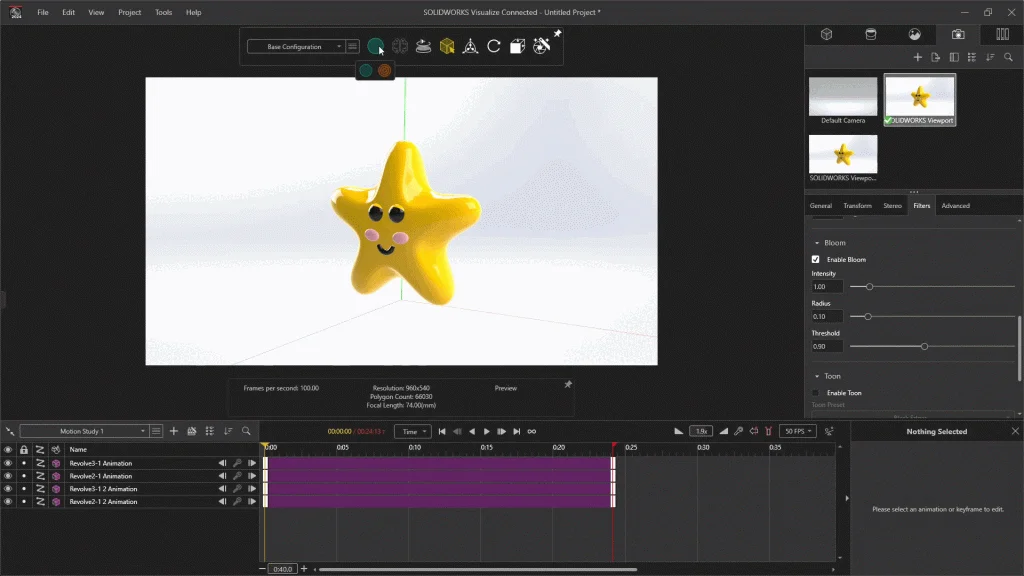 Moving into part 2 of this tutorial, it’s time to animate the star! Before you do this, if you’re using the SOLIDWORKS Connected version, the SOLIDWORKS Visualize add-in is not available just yet, so to retain the motion study information, check the icon seen below, this will open my assembly in Visualize and the motion study will come in as animation keyframes.