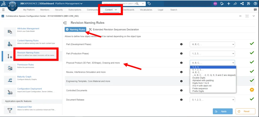Login to the platform administrator dashboard & look for the Revision naming rules present in the content tab. Here in ‘Naming rules’ section we can see all the types of objects that support revisioning. Let’s focus on the physical product for our example.