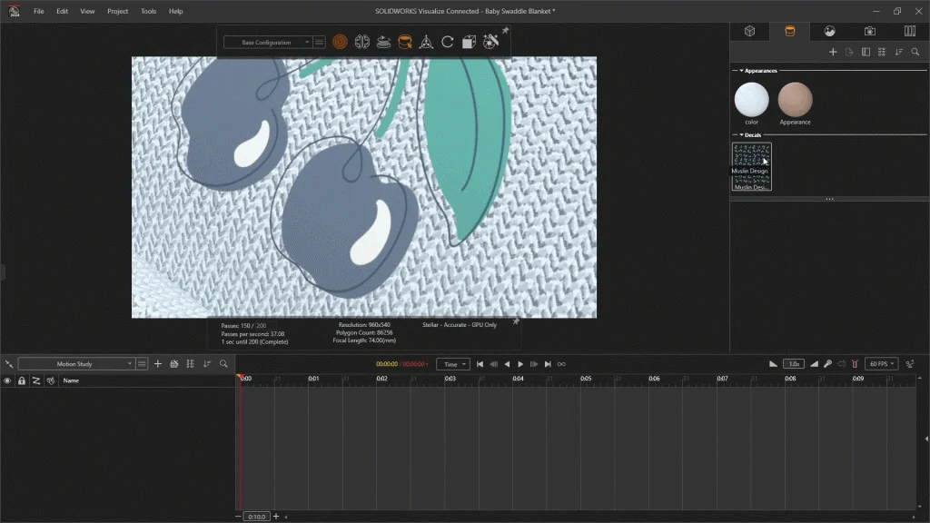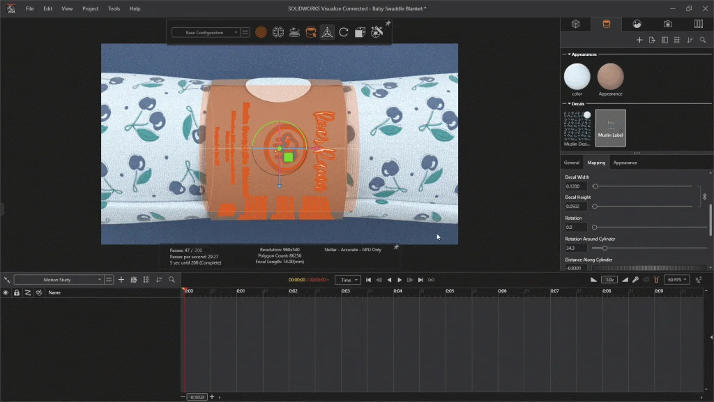 For this tutorial I wanted to share a personal project I’m working on. I decided after having my two sons that I wanted to start designing and eventually producing my own baby muslin swaddles and what better way to test them out than rendering my designs with Visualize. With SOLIDWORKS Visualize I can experiment with different decal patterns and designs, different colors and textures, and also the packaging type and brand logo. The rolled-up baby swaddle and the packaging sleeve was modeled using the 3DExperience Platform’s xShape app, it was then exported ready to be opened in Visualize. This tutorial will have a follow-up tutorial, where I will show you how I would prepare my design for manufacturing using a SOLIDWORKS Drawing.