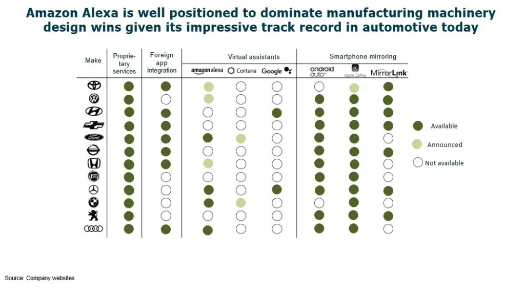 - Virtual agents have the potential to redefine many areas of manufacturing operations, from pick-by-voice systems to advanced diagnostics. Apple’s Siri, Amazon’s Alexa, Google Voice, and Microsoft Cortana have the potential to be modified to streamline operations tasks and processes, bringing contextual guidance and direction to complex tasks. An example of one task virtual agents are being used for today is guiding production workers to select from the correct product bin as required by the Bill of Materials. Machinery manufacturers are piloting voice agents that can provide detailed work instructions that streamline configure-to-order and engineer-to-order production. Amazon has successfully partnered with automotive manufacturers and has the most design wins as of today. They could easily replicate this success with machinery manufacturers.