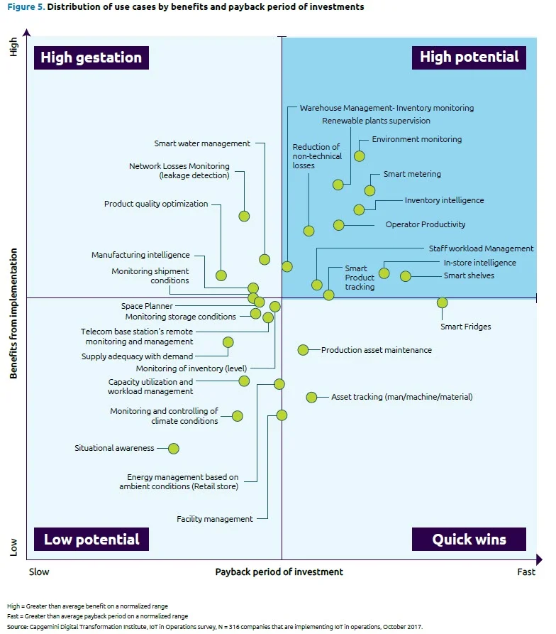 - Design in the Internet of Things (IoT) support at the data structure level to realize quick wins as data collection pilots go live and scale. ERP platforms have the potential to capitalize on the massive data stream IoT devices are generating today by designing in support at the data structure level first. Providing IoT-based data to AI and machine learning apps continually will bridge the intelligence gap many companies face today as they pursue new business models. Capgemini has provided an analysis of IoT use cases shown below, highlighting how production asset maintenance and asset tracking are quick wins waiting to happen. ERP platforms can accelerate them by designing in IoT support.