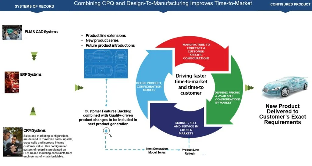 The most effective CPQ tools are available as part of a modern ERP system due to the accuracy and timeliness of working from the same data. This translates into improved price management and control across channels, increased margins, and reduced order errors in the process—helping speed time-to-market and preserve margins. Additionally, by adopting CPQ and ERP capabilities as part of a design-to-manufacturing strategy, manufacturers can speed new product development cycles, improve product quality, and increase yield rates. The following graphic explains why having a CPQ system integral to an ERP platform helps accelerate time-to-market.