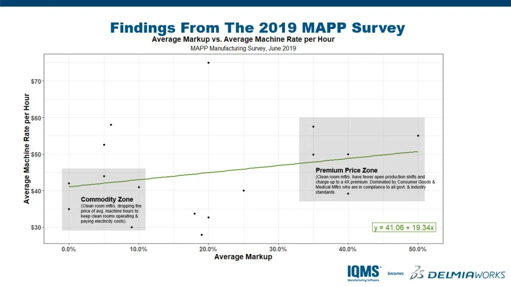 Cleanrooms are providing plastics manufacturers with an opportunity to differentiate themselves and charge a higher average machine rate per hour & higher average order markup while also providing short-notice, specialized production runs to their cleanroom customers. Plastics manufacturers with cleanrooms tend to be in the Commodity Zone of attempting to compete on price and availability versus those in the Premium Price Zone. Those in the latter group can sell cleanroom services at a higher average machine rate per hour and a higher average markup. The following is a correlation comparing the average machine rate per hour by average markup based on the 2019 survey of plastics manufacturers by the Manufacturer’s Association for Plastics Processors (MAPP).
