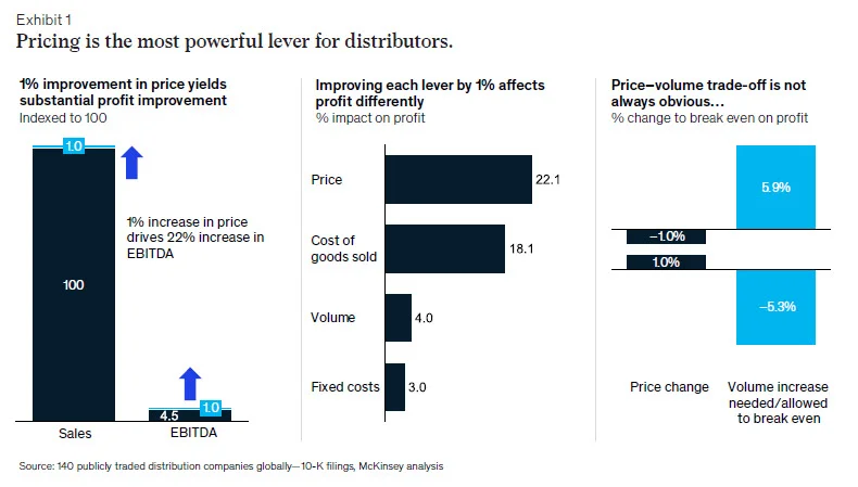 - A 1% price increase yields a 22% increase in Earnings before Interest & Taxes (EBITDA) margins for distribution-based businesses.