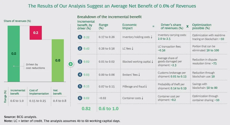 - Lower costs. The ability to reduce inventory levels using insights from blockchain and IoT can help manufacturers to cut their inventory management costs and bank fees for letters of credit. Notably, the availability of blockchain via the cloud is helping to increase the potential return on investment. For example, in its study, “Pairing Blockchain with IoT to Cut Supply Chain Costs,” Boston Consulting Group (BCG) calculated how much a $1B electronics equipment company could save by implementing blockchain-as-a-service, a decentralized track-and-trace application, and 30 nodes that share among key supply chain stakeholders. The study found that the electronics equipment company could save up to $6 million per year.