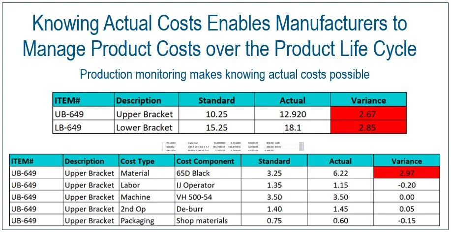 Finance, accounting, MES, ERP, and real-time monitoring on the same database help to isolate cost variances. The table below is based on data from real-time production monitoring that is a core part of an integrated ERP system, DELMIAWorks. Note how real-time monitoring immediately identified the Upper Bracket and Lower Bracket cost variances. Production, Accounting, Finance, and Supply Chain teams will get an alert on their phones or mobile devices showing the variance, so the teams can work together to eliminate the difference.