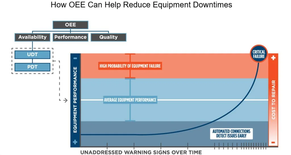 The diagram below illustrates a use case for OEE. Having a true measure of machine availability, including Unplanned Downtime (UDT) and Planned Downtime (PDT), finds early signals of equipment malfunction, averting costly shutdowns.