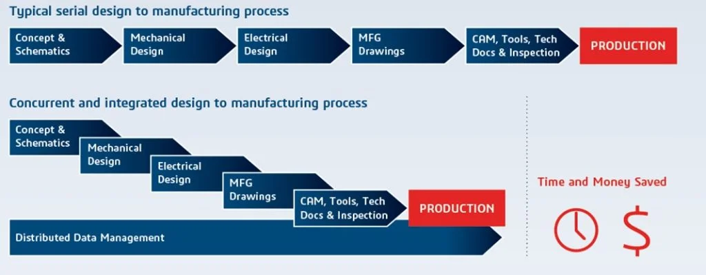 The more integrated product design, engineering, and production are the more likely it’s going to be able to flex and scale in response to customers’ demands. Product models need only be defined once in the CAD system to serve as the multifaceted information needs of each phase of manufacturing. When simulation/FEA, Electrical, Computer-Aided Manufacturing (CAM), Inspection, work instructions, and ERP systems all share a common, product quality improves, customer delivery dates get met and new products are delivering on time.