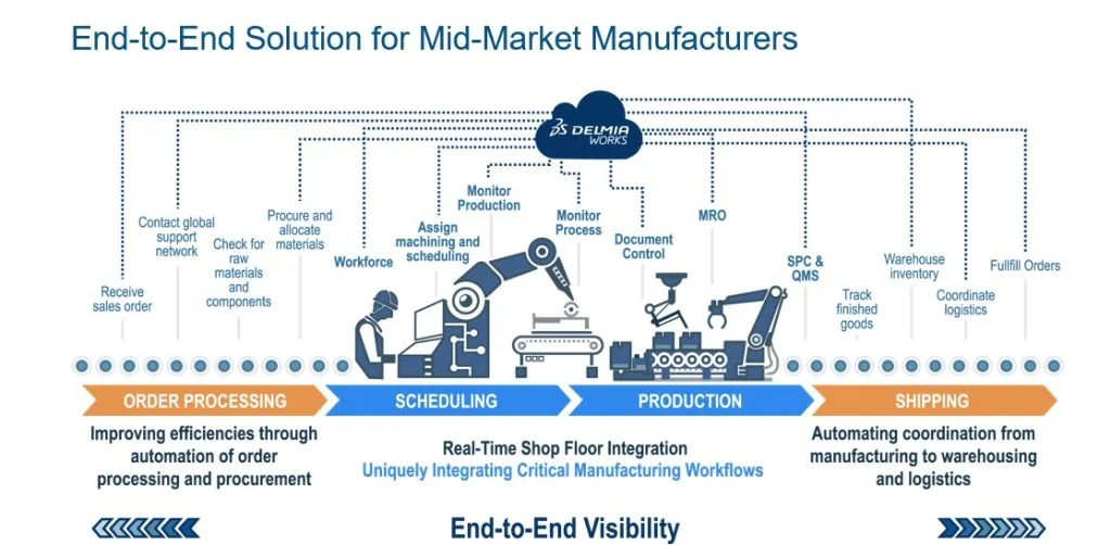 ERP systems that excel at providing the visibility and control needed from the shop floor to the top floor don’t require 3rd party integrations, provide for a seamless information flow, digitally transform production operations with one system, and most importantly, support multiple manufacturing types with pre-built workflows. In short, the purpose-built design of the DELMIAworks 2020 platform and its support for 21 pre-built manufacturing types has evolved over decades of development to provide shop floor to top floor visibility and control of manufacturing operations and his shown below: