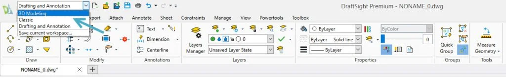 All the tools you’ll need for 3D modeling in DraftSight are found in the 3D Modeling Workspace. Use the Workspace pulldown menu to change your current Workspace to 3D Modeling.