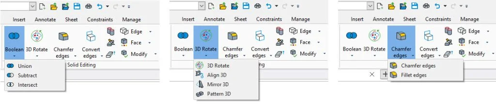 DraftSight Premium and Enterprise Plus provide all the editing tools you’ll need from within the Solid Editing panel of the Ribbon (from within the 3D Modeling workspace).