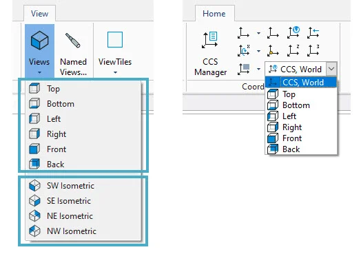 In Part 1 of this series, we suggested that you start your 3D modeling session by switching to one of the preset Isometric views. You’ll also notice that within the Views pulldown there are some presets for Top and Bottom, Left and Right, and Front and Back. These presets are often used in conjunction with a Custom Coordinate System, so you’ll also find them in the CCS pulldown. Since this is in the Home tab with your other 3D commands, setting these views here will save you from having to change Ribbon tabs.