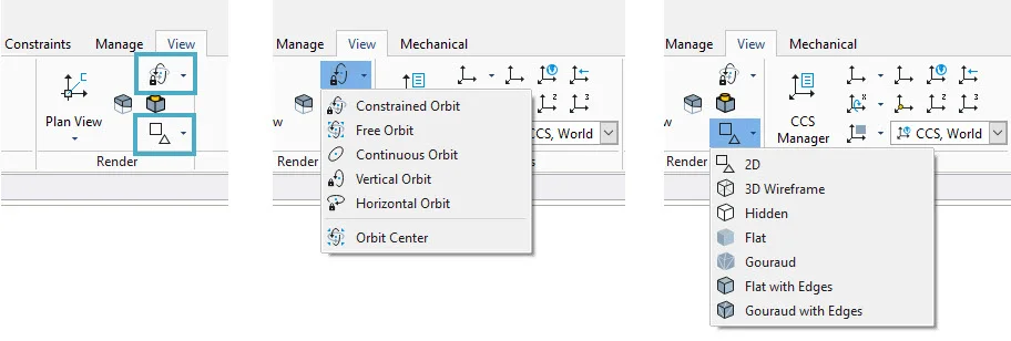 The 3D environment adds an important set of tools to enhance your viewing. They are the Orbit tools and are found in the Render panel of the Ribbon’s View tab.