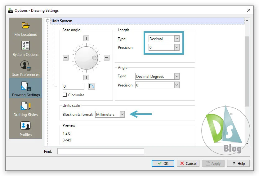 In other words, you decide what a drawing unit represents. That unit designation could be literally anything, from a Plank to a Parsec. It’s just a unit to DraftSight. Since we’re setting up to use millimeters, which is what we’ll define to be a unit. So, as you draw (along with any teammates), you’ll need to remember that a unit is equivalent to a millimeter every time you (or your teammates) use the drawing. Also, it’s most common to have your Precision set to zero. If you’re using a meter as your base unit, you’d want to use three places of precision.