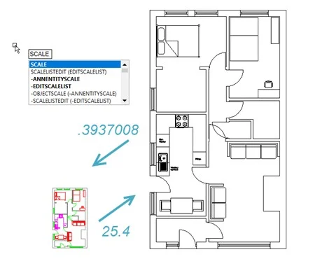 Since we’re scaling down, you’ll need to use the inverse of 25.4, which is 0.3937008 (to seven places). If you know Lisp (or even if you don’t), you can also enter a Lisp expression at the scale factor prompt. So, instead of the aforementioned decimal fraction, you can just enter (/ 1 25.4) at the prompt!