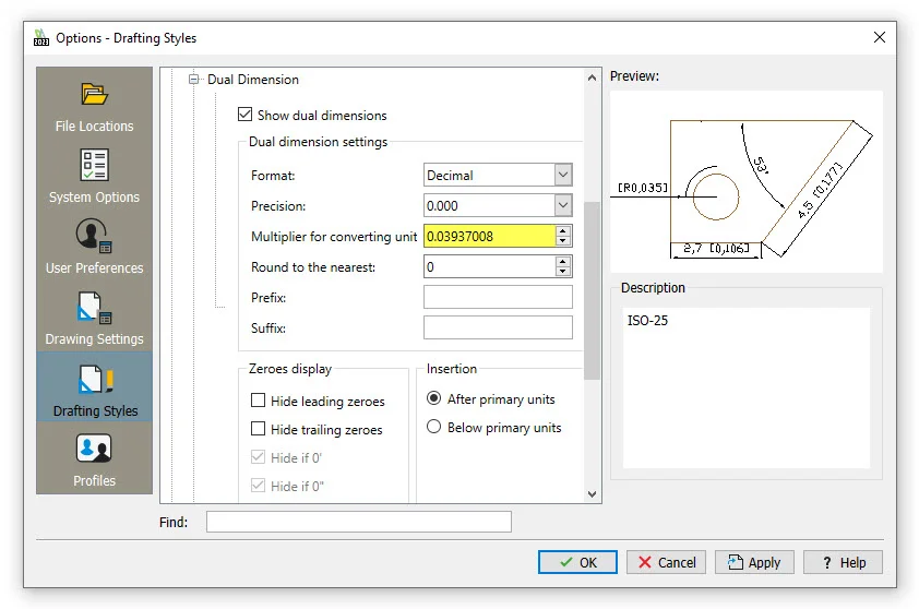 While we’re on the subject, there may be times when the job uses both systems. Your project may specify that the main dimensions be displayed as Imperial units (typically Architectural) and also an alternate unit, or millimeters. Fortunately, DraftSight has a Dual Dimension option for your dimension style. Notice in the image below that it already has the inverse of 25.4 as the default. Plus, it’s a handy place to find the conversion multiplier.