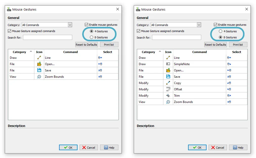 DraftSight allows either four gestures, which correlate to moving the mouse up, down, left, or right, or eight gestures, which add the diagonal directions.