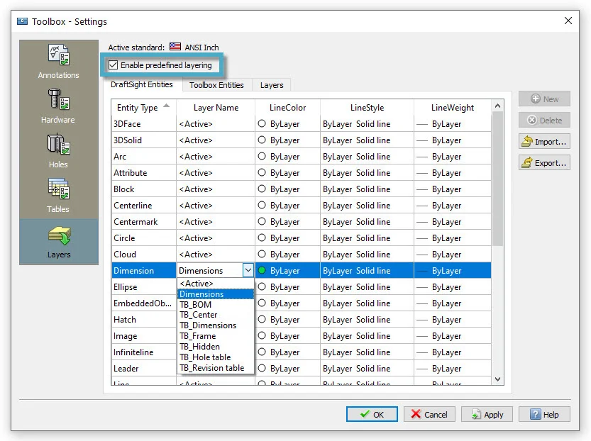 “But Lynn”, you’re saying… “that doesn’t help me, I’m in architecture.” Well, there is a part of the Toolbox that everyone can use, and it can really help you maintain your CAD standards. It’s call Toolbox Layers, or TB Layers for short. It allows you to map the layer of your choice to any type of DraftSight Entity. You can even specify the LineColor, LineStyle, or LineWeight if you want.