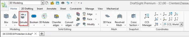 The Extrude command can be found in the 3D Modelling menu DraftSight Premium 2020. You can also enter it in the Command Prompt. I’m old-school, so I tend to use the Command Prompt for nearly everything!