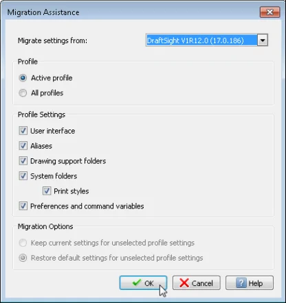 Basically, the installation routine has noticed a previous install of DraftSight on your computer. Just click on Yes to continue with the update and the installer will remove the previous version of DraftSight while retaining any custom configurations you may have. Once the previous version of DraftSight has been removed, the latest version, DraftSight 2020 Service Pack 3, will install. The Migration Assistance dialog box will then appear on screen. This allows you to migrate settings from previously installed versions of DraftSight.