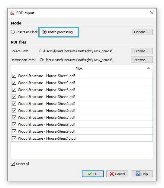 Again, choose any or all of the PDFs that will be displayed for you. Once you’re happy with your selection, click OK to start the processing. The processing happens quickly, and you’ll end up with a folder full of DXF files that contain your valuable PDF information.