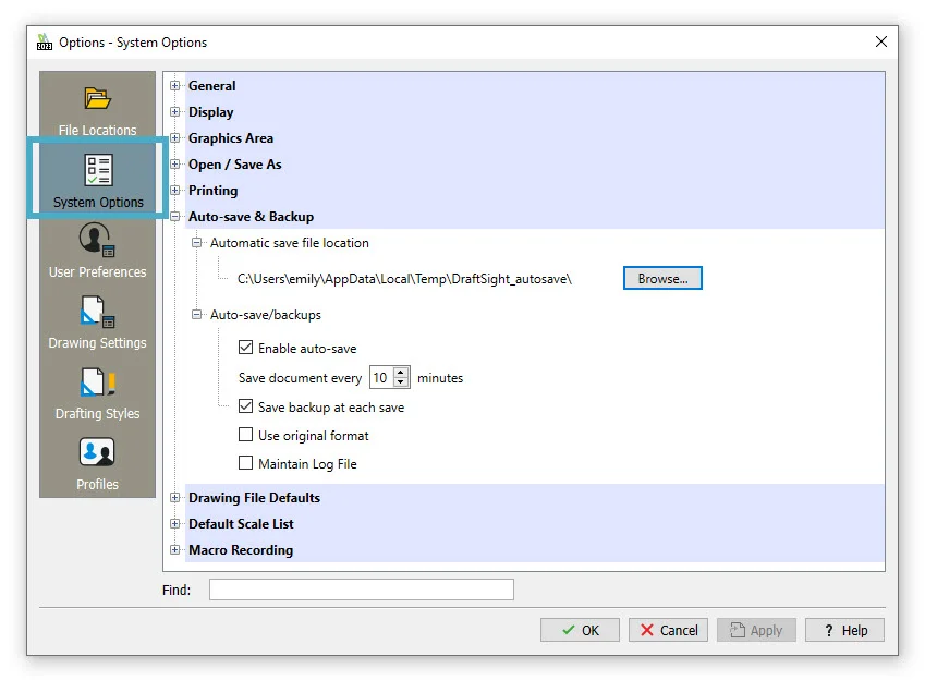 Fortunately, DraftSight has some utilities to help you minimize the chance of lost work. The first one is called Auto-save. You can find the controls for it via the Options dialog and within the System Options tab. Of course, to use it, it will have to be enabled by making sure the Enable auto-save entry is checked.