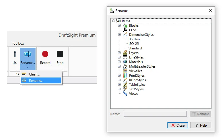 Have you ever needed to change the name of a named item in DraftSight? Named items are things like layers, blocks, styles, etc. In fact, all the things you see in the following image. It happens all the time and for various reasons. DraftSight makes it easy for you. You’ll find the RENAME command in the pulldown menu in the Drawing panel of the ribbon’s Manage tab.