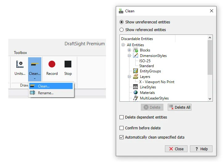 You can find the CLEAN command in the same pulldown as the RENAME command (the most recently used will become the displayed icon). Much like Rename, it works on the named items list. If an item, such as a block or a layer, isn’t referenced anywhere in the drawing, it will appear in its category and can be removed from the drawing database. For a complete reference guide on using it, feel free to check out this post on the DraftSight blog.