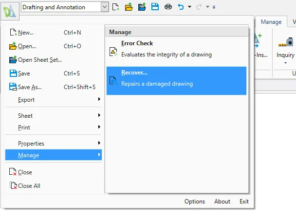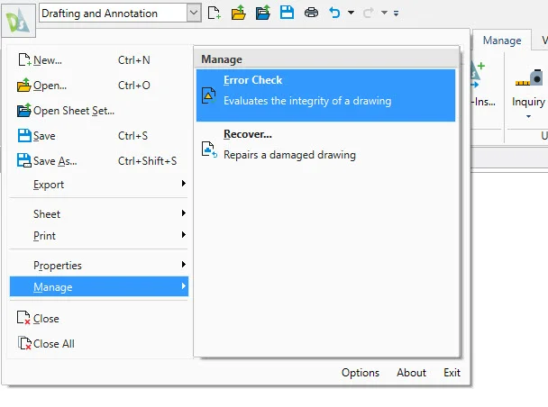 The second part of the file maintenance procedure is to periodically audit the DWG file for errors and be given the option to fix them, if found. This is done using the CHECK command, which you can find in the Application Menu. Expand the Manage entry to find the icon labeled Error Check.