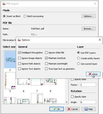 When you import a PDF drawing with layers, all the sheets will be presented on the preview dialogue and you can adjust the options to use the PDF layers.