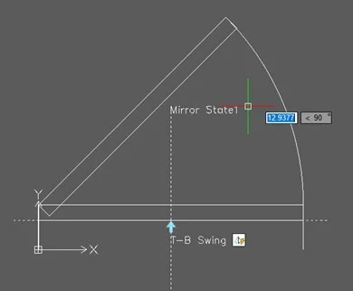 I’ve selected the bottom midpoint of the “closed” door. This is where your arrow grip will appear. Next, you’ll be prompted to specify the endpoint of the mirror axis. I have Ortho on, and I want this grip to define the horizontal mirror, so I’ll pull out to the right and click to select.