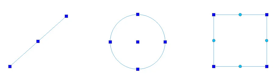 When eGrips are enabled (we’ll talk more about that later), they will appear at the geometric definition points of a selected entity, typically as blue squares but sometimes as a cyan circle (see the rectangle below). As you can see, a line will have an eGrip at either endpoint; along with its midpoint, a circle has eGrips at the center and quadrants, and the polyline rectangle has eGrips at its vertices. Blocks and Notes will have a single eGrip at their insertion points.
