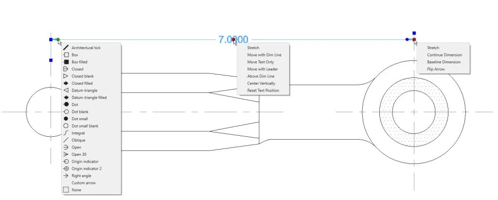Depending on the type of entity you select, you’ll get a set of tools that is specific to that entity. Select a Hatch, and you’ll get hatch editing options. Select a Table and get tools specific to tables. Egrips on different parts of an entity can also have their own set of tools. In our example below, you can see how you get different tools depending on which Dimension eGrip you hover over.