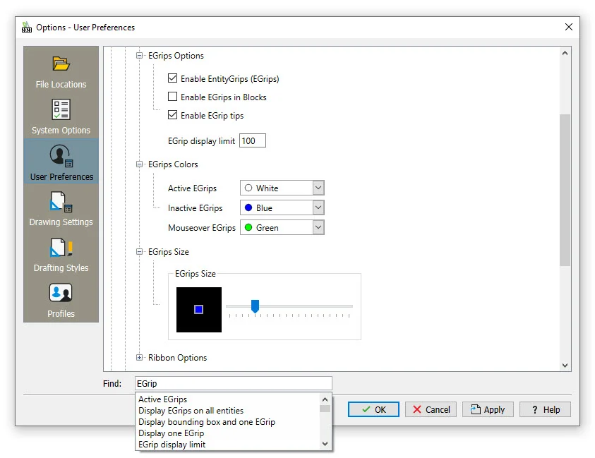 Finally, a word on the options available for using and displaying eGrips. From the User Preference tab of the Options dialog, in the Entity Selection entry of the Drafting Options menu item, you’ll find your eGrip entries. If that sounds complicated, or at least hard to remember, use the Find box like we’ve done in the image).