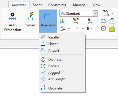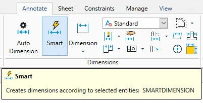 Next to the pulldown in the ribbon is a relatively new way to dimension your designs. It’s called Smart Dimension. You’ll notice that it is not a pulldown with other options. All of your various types of dimensions are contained within the Smart Dimension tool.