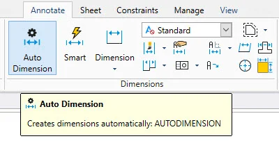 The next way to apply your dimensions is unique to DraftSight. It’s called Auto Dimension, which can be found just to the left of Smart Dimension in the ribbon.