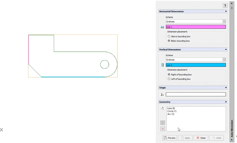 You can specify whether Horizontal and Vertical Dimensions will be Baseline, Continuous, or Ordinate dimensions. You’ll also need to decide if you want the Horizontal dims to be placed above or below the bounding box, and whether the Vertical dims are to the right or left.