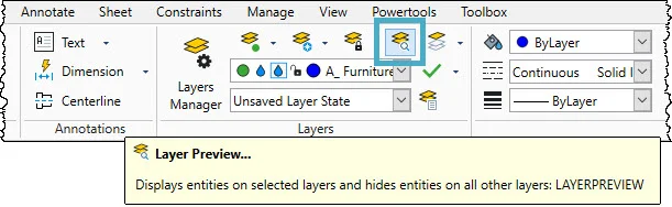There are two other very important controls that you need to know about. Whenever I tell users about Layer Preview, there’s usually some concern about it changing the current state of the drawing’s layers. As long as you’re paying attention, there’s no need to worry.