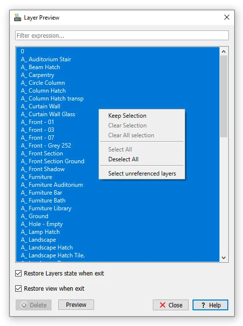 So, with the multiple selection option, you can isolate a layer group, such as a particular discipline’s layers (which, if they use the AIA layering standard, will start with A- for architectural, or S- for structural, etc.).