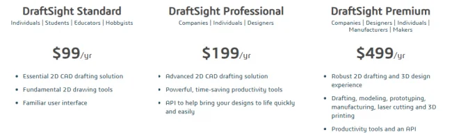 Depending on the version of DraftSight you choose, you can get DraftSight for as little as $99.00 a year.