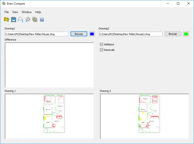Once you click the Compare Drawings button, all the changes between the drawings will be highlighted in the Difference screen. Differences in Drawing 1 are shown in Blue, and in Drawing 2, they are shown in Green.