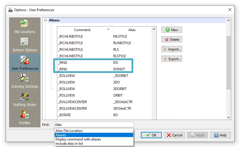 The first group you need to know about are command aliases. An alias is usually a single letter shortcut (sometimes more) that runs a command. For instance, typing “L” will run the Line command. It’s an incredibly efficient way to access your commands. Here’s the cool thing about aliases in DraftSight: In addition to a short version of a command, the AutoCAD® command equivalent is mapped as well. So, if you want to draw a RING in DraftSight, you can continue to use DO or DONUT just like you might be used to doing.