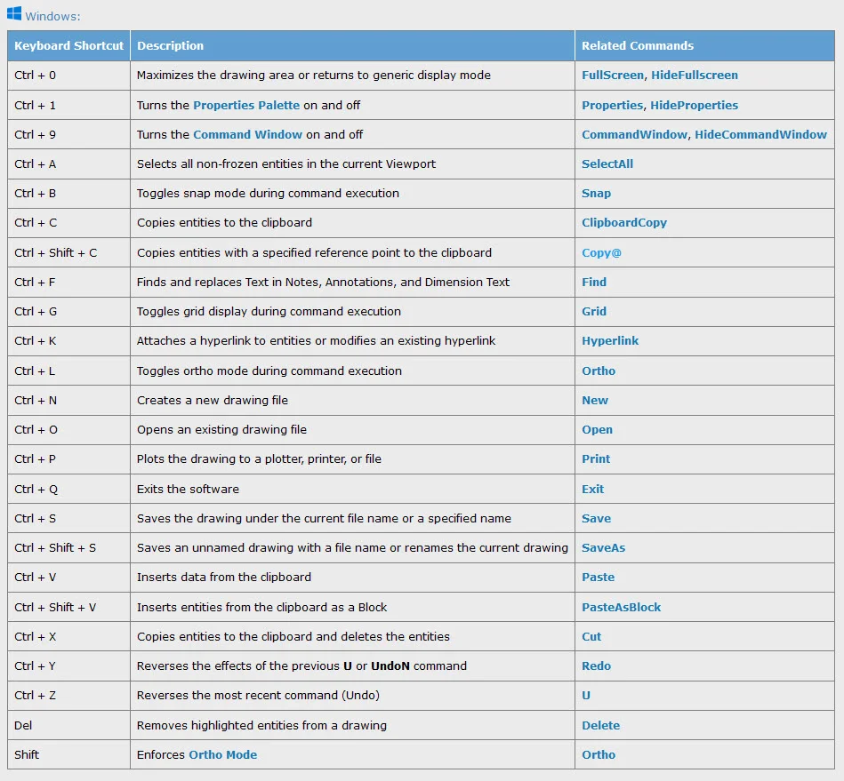 The next group of time saving typing tricks are called Keyboard Shortcuts. If you’re already familiar with your operating system’s shortcuts, you’ll find that most are the same in DraftSight. These typically start with the Control key (in Windows… it’s the command key in macOS) along with a letter or number. Sometimes the Shift key is needed also. For instance, I use Ctrl + S all the time to incrementally save my work. I’m also an addict to using Ctrl + C and Ctrl + V to Copy and Paste. Again, these are typical in most Windows apps, but others are DraftSight specific, such as Ctrl + B to toggle Snap on and off.