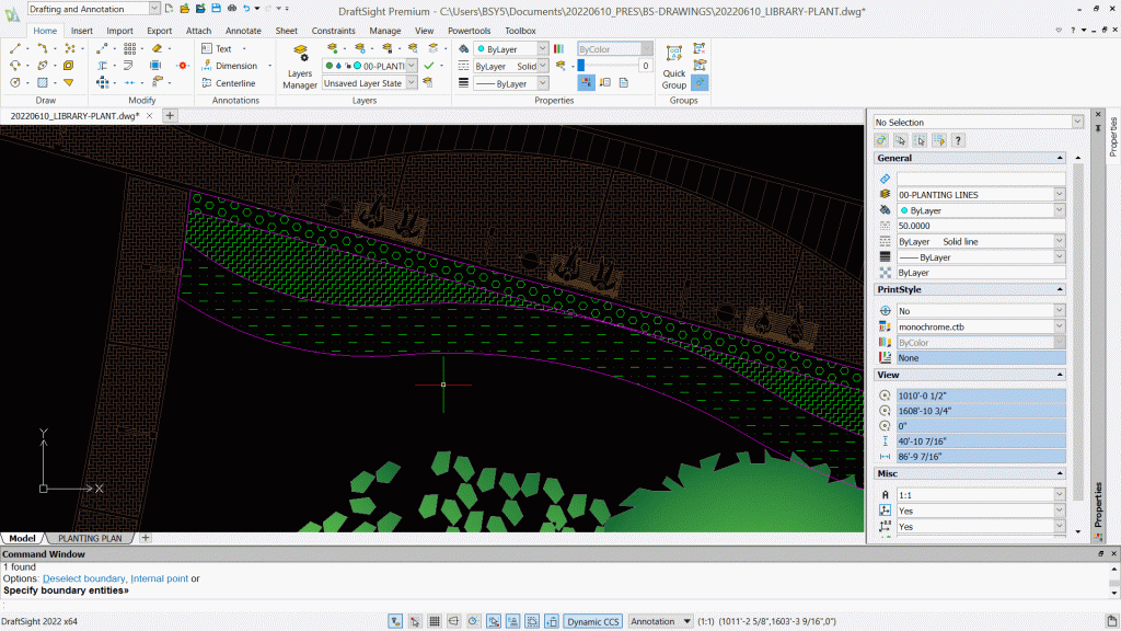 Start by drawing the lines of the planting bed. These lines define where each type of vegetation will be placed. In DraftSight, you can use the LINE or POLYLINE commands, depending on whether you’re drawing individual lines or connected shapes. These bed lines give your drawing structure and help define areas for trees, shrubs, or groundcover.