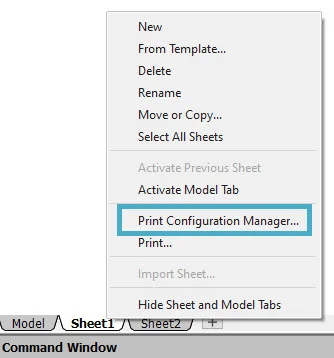 Let’s take a look. As usual, the first step is to run the Print Configuration Manager by right clicking on either the Model tab, or the active Sheet.