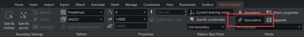 2. On the Hatch Creation ribbon, click the Associative icon under the Mode panel. Make sure the icon is highlighted in blue under the light mode UI and highlighted in black under the dark mode UI.