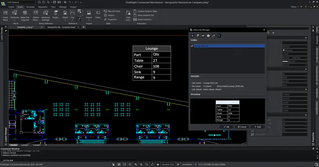 Users who manage tables and data in excel will also be excited to use the new Data Link manager. Enjoy the ability to import and manage excel tables with two-way communication between DraftSight 2024 and Excel. Whether changes are made in DraftSight or in your spreadsheet, ensure that information is always up-to-date and accurate.