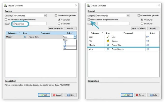 Here it’s showing the defaults, which aren’t terribly exciting, but you can change them very easily. Just use the Search box for whatever command you want to assign to a gesture. Since I’m a big fan of Power Trim, we’ll search for that.