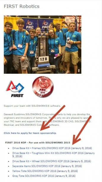 Apply for SOLIDWORKS sponsorship. Download 2016KOP at www.solidworks.com/FIRST. The zip files are separated by components and kits.