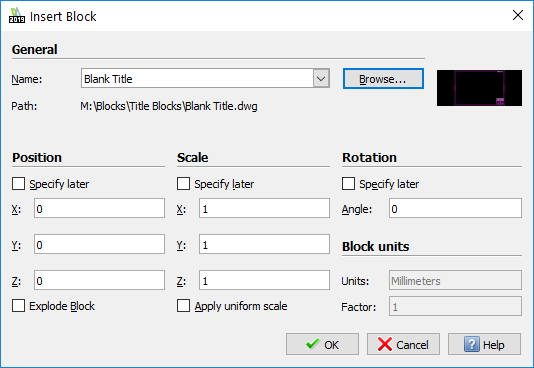 I leave the Position, Scale and Rotation check boxes unchecked as I want the Title Block / Sheet to go in at 0,0,0 and at a Scale of 1 and not Rotated. The Title Block / Sheet I use prompts the user to fill in data as it is been inserted. As you can see below, it is looking from Project Title information. It will also prompt the user to insert Drawing Name, Project Number, Revision Number, Drawn By and a few other data fields. In a future blog, I’ll show you how to create a Title Block / Sheet with these attributes.